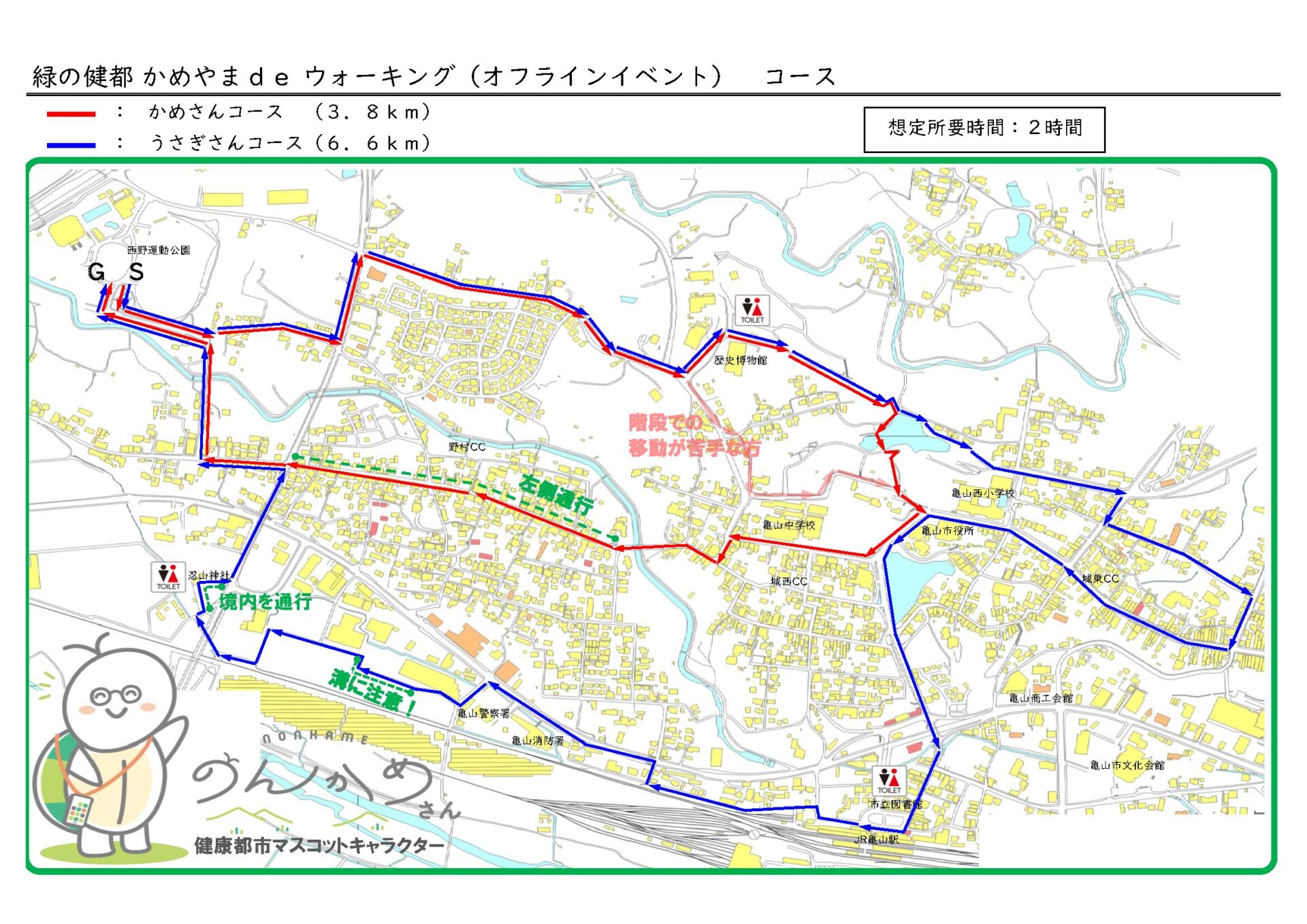 コースは西野公園をスタートして、亀山市街地にある城跡公園である亀山公園を分岐に、のんびりは亀山城跡や慈恩寺などを経由して約3.8㎞、うさぎさんコースは亀山市役所やJR亀山駅前、忍山神社を経由射して6.6㎞を歩きます。